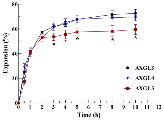 Expansion profile of AX-GL films in a simulated wound environment. The asterisks (*) represent a significant difference (* p < 0.05) of AXGL5 from AXGL3 and AXGL4.
