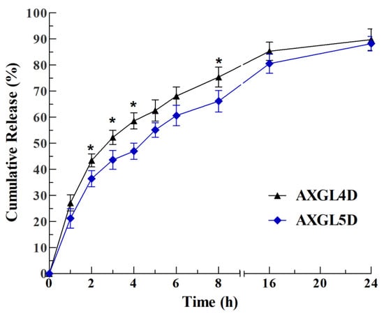 Gentamicin release profile from AX-GL films. The asterisks (*) represent a significant difference (* p < 0.05) of AXGL4D from AXGL5D.