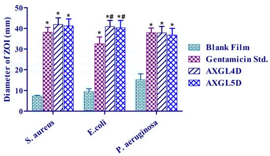 The results of the assessment of the antibacterial effect of the AX-GL films against bacteria that are commonly found in infected wounds are presented in Figure 6. These results reveal that the blank AX-GL film did not show significant antibacterial, while the standard GM solution and AX-GL films exhibited significant antibacterial activity against tested bacteria. Moreover, the values of the ZOI signify that the GM-loaded AXGL4D and AXGL5D films effectively inhibited bacterial growth. Moreover, the inhibition zones around the AX-GL films were larger than those around the standard GM films (Figure S3). When placed on growth media, films absorb water, undergo swelling, and release loaded antibiotics, similar to when films are placed on infected wounds. Therefore, the higher antibacterial activity of AX-GL films indicates the ability of these films to maintain the effective concentration of GM in the wound environment for a longer period of time []. These results suggest that the antibacterial performance of the GM-loaded AX-GL films was better than that of previously reported GM-loaded collagen, chitosan, and hyaluronic polymeric film dressings [].