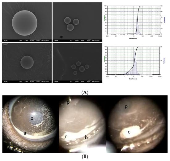 Visualization of microsphere (Ms) Scanning Electron Microscopy (SEM). (A) (SEM) images and poly (lactic-co-glycolic) acid (PLGA) microsphere particle size distribution, 38–20 µm Ms (top); 20–10 µm Ms (bottom) and monodisperse size distribution. Individual microspheres magnification 2500× and group microspheres 700× (B) Microsphere distribution in the anterior chamber of a rat eye during follow-up. Abbreviations: p: pupil; r: light reflex; a: microspheres at inferior iridocorneal angle; b: remnants of microspheres; c: microsphere pellet.