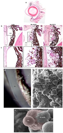 Visualization of microspheres at the iridocorneal angle with Hematoxilin/Eosin and scanning electron microscopy. (A–C) Localization of microspheres at the iridocorneal angle hampering the trabecular meshwork. Hematoxilin/Eosin histological sections at the level of the optic nerve. Arrowhead: microsphere in contact with the endothelium of the cornea. Scale bars for subfigure (B) is 53.47 μm and for subfigure (C) is 6.73 μm. (D–F) Dissection of the iridocorneal angle. The cornea has been sectioned and removed leaving the anterior eye chamber visible. Notice the whitish appearance of the microspheres. (E,F) Scanning electron microscopy images. In (F) an aggregate of microspheres is visible at high magnification. This PLGA structure is partially covered by two pseudopodia from a cell (colored in red) compatible with a macrophage. Scale bars for subfigure (E) is 5.4 μm and for subfigure (F) is 1.66 μm. Abbreviations: ICA: iridocorneal angle; ON: optic nerve; Tm: trabecular meshwork; Co: cornea; Ir: iris; L: lens; Ma: macrophage; CON: control eye; Ms38/20: eye injected with Ms size 38–20 µm; Ms20/10: eye injected with Ms size 20–10 µm.