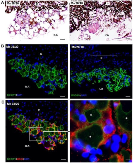 Identification of microspheres. (A) In Hematoxilin/Eosin-stained paraffin sections, microspheres (*) appeared transparent and colorless. They were surrounded by cells, sometimes containing black pigment. (B) Microspheres were specifically marked by boron-dipyrromethene (BODIPY) fluorescent dyes. (C) Double immunofluorescence using anti-Mac2 antibody, a specific marker of macrophages, showed that microspheres were surrounded by macrophages. Nuclei counterstained with Dapi. ICA: iridocorneal angle; Ir: iris; 38/20 and 20/10 µm microspheres. Scale bar: (A) 21.58 μm, (B) 18.49 μm, (C) 18.49 μm.