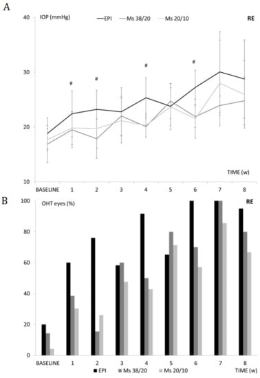 Analysis of intraocular pressure (IOP). (A) Right eye IOP curve in ocular hypertensive (OHT) models over follow-up. (B) Percentage of OHT right eyes (>20 mmHg) in the three OHT models over follow-up. Abbreviations: EPI: episcleral sclerosis model; Ms38/20: 38/20 microsphere model; Ms20/10: 20/10 microsphere model; RE: right eye; IOP: intraocular pressure; w: weeks, OHT: ocular hypertension; (%): percentage; #: statistical significance p < 0.020, for Bonferroni correction for multiple comparisons.