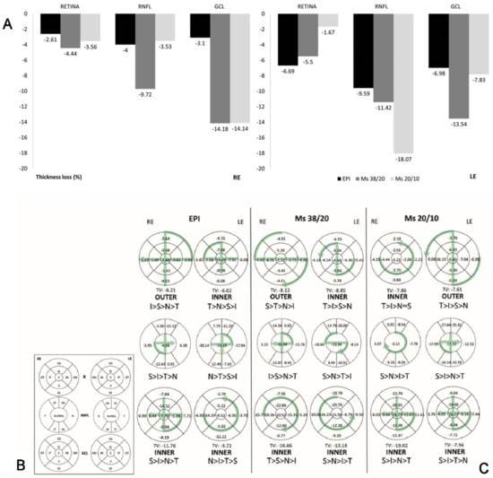 The perceptual loss of thickness detected by OCT (change in thickness with respect to the baseline measurement of each variable) was also analyzed. At the end of the study, the Ms38/20 model showed the highest percentage thickness loss in all OCT parameters in REs and in GCL in LEs. The GCL parameter experienced the greatest loss in each Ms model. Both the EPI and Ms20/10 models experienced this RNFL > GCL > retina loss trend in LEs. Nevertheless, no statistical differences in thickness were found between REs and LEs in the Ms models (Figure 5A).