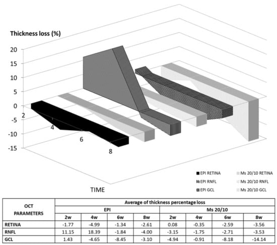 Ms38/20: REs showed a progressive decrease in retina, RNFL and GCL thickness. The thinnest sectors measured in the retina were the inner superior and inner temporal sectors; in the RNFL it was the nasal sector; and in the GCL they were the inner temporal and central sectors. Although a statistically decreasing trend was found in the retina and GCL, the retina and RNFL parameters showed an increase in thickness in the transition from weeks two to four (see Table S1). Left eyes (LEs) also experienced a statistical decrease in thickness in the retina, RNFL and GCL at week eight in most retinal sectors, as well as in the superotemporal sector of the RNFL and in the superior–inferior axis of the GCL (see Table S2).
