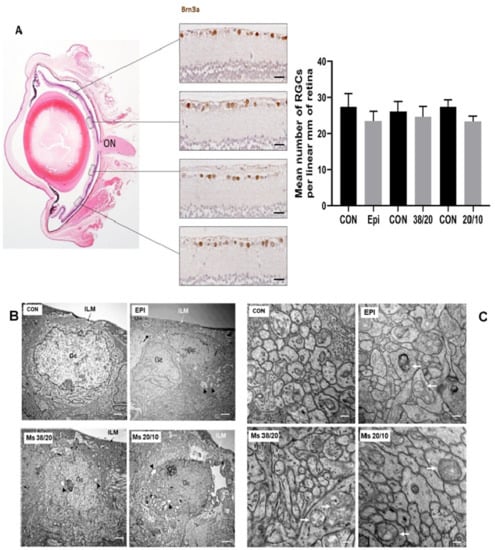 Neurodegeneration of (A) ganglion cell layer, (B) somas and (C) axons. (A) Ganglion cell analysis. Ganglion cells were counted in radial sections of the eye along 2 mm of a linear region of the retina. These corresponded to four areas, two on each side of the optic nerve (ON). Nuclei of ganglion cells were marked with anti-Brn3a. Right image: mean number of ganglion cells per linear mm of retina. Scale bars: 27.73 μm. (B) Degeneration of ganglion cells in OHT models at 8 weeks. Nuclear and nucleolar ultrastructural alterations, including indentations of the nuclear membrane and cytoplasmic vacuolization were observed in all OHT models. Scale bars: 1.13 μm. (C) Enlarged mitochondria (arrows) were observed in the axons of ganglion cells in all OHT models at 8 weeks. Scale bars: 0.29 μm. Abbreviations: EPI: right eyes injected in the episcleral vein; Ms38/20: right eyes injected with 38–20 µm microspheres; Ms20/10: right eyes injected with 20–10 µm microspheres; RGC: ganglion cell; CON: right eye from a nontreated rat; GC: ganglion cell; ILM: internal limiting membrane.