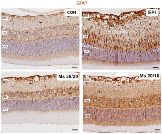 At eight weeks postinjection, retinal morphology was analyzed in the hypertensive rat models. No obvious histological signs of retinal degeneration were observed (Figure 7A). However, ultrastructural analysis showed a process of ganglion cell and photoreceptor degeneration (Figure 7B,C). Common lesions observed in ganglion cells in all the hypertensive models were indentations of the nuclear membrane and cytoplasmic vacuolization (Figure 7B). Furthermore, as occurs in experimental glaucomatous mice after injection of microbeads in the anterior chamber [], the axonal mitochondria of ganglion cells in all hypertensive rat models were enlarged and degenerated, showing fewer cristae (Figure 7C). Brn3a-positive ganglion cells were counted in radial sections of the retina along 2 mm of a linear region of the ganglion cell layer. These corresponded to four areas, two on each side of the optic nerve head (Figure 7A) No significant differences in the number of ganglion cells were found among the hypertensive models (EPI 23.51 ± 2.59 vs. MSs38/20 24.50 ± 2.96 vs. MSs20/10 23 ± 1.15 mean number of ganglion cells per linear mm of retina, n = 6, p = 0.901) (Figure 7A). Micronuclei and loss of heterochromatin were observed in the rod photoreceptors of all hypertensive models. Increased expression of GFAP in cytoplasmic prolongations of Müller cells (gliosis) was observed in the entire retina of all hypertensive models (Figure 8).