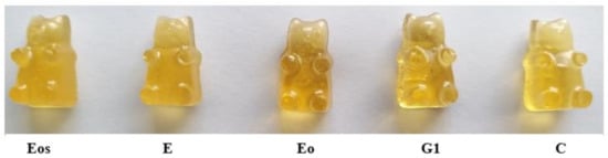 Three tablets (Eo, G1 and C) of five (in Figure 1) were transparent, the Eo tablet was of the darkest color compared with all other chewable tablets’ composition, which are presented in Figure 1. The Eos and E tablets were opaque, and a difference in the color of the gelatin-based tablets with the use of ethanolic extract or ethanolic essential oil solution was not found. This picture shows how different the colors of gel tablets can be by using a different preservative and its forms. All tablets (10 compositions) were yellow or amber color with a different undertone.
