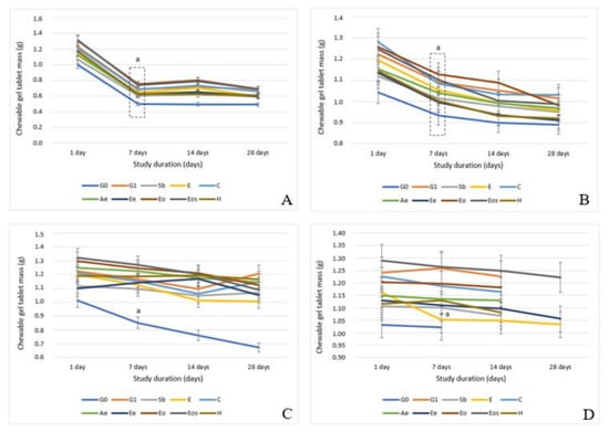 The mass changes in different storage locations were determined. All chewable gel tablets were weighed for four weeks and the differences of mass are presented in Figure 2. In Figure 2A, the mass variation in a room temperature in an open plastic bag is presented.