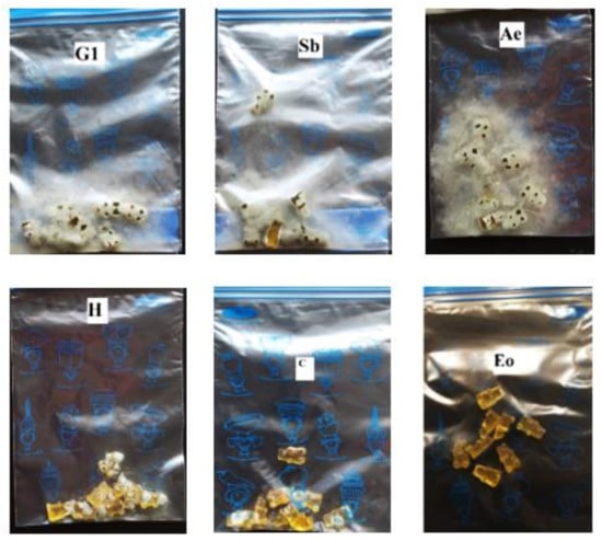 Mold growth on chewable gel tablets (G1, Sb, Ae, H, C, and Eo) after 52 days, n = 8 (number of tablets in the plastic bag).