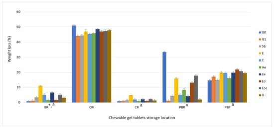 To compare storage conditions and containers, the opened plastic bag (OR) had the highest influence on the weight loss of gel tablets, all samples lost over 40% of mass and it was determined that glycerol significantly protects chewable gel tablets from weight loss when the tablets are in an open-air container. Temperature below zero (PBF) has an influence on water separation from gel tablets base—as was determined when they were left in a room temperature for 30 min (Figure 6). The safest containers to hold chewable gel tablets mass’ uniformity is an airtight box (CR). These storage conditions have the smallest influence on weight loss and a higher influence on shelf-life (Figure 3).