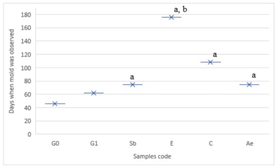 Chewable gel tablets shelf-life in a closed plastic box at room temperature (CR). a—p < 0.05 vs. G1; b—p < 0.05 vs. C; n = 8; * study duration was 180 days; Ee, Eo, and Eos did not have a mold after 180 days, these samples are not presented in this figure.