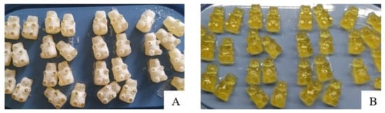 Chewable tablets are a popular dosage form for children, elderly patients or for those who have swallowing disorders. Water is not required for the use of these tablets because they are chewed and saliva moisturizes the tablet mass, which is then easily swallowed, so it is comfortable to use on a journey or in places where it is difficult to get water [,]. The most popular chewable tablets are tablets such as paracetamol, acetylsalicylic acid, ibuprofen [] or other tablets which have an active substance and many excipients, and are mostly opaque or white in color, and are prepared by compression. Another group of chewable tablets are chewable gel tablets which are commonly referred to as gummies [,]. These tablets are prepared by using forms (silicone, metal or other) and are not compressed by tablet machines’ punches such as simple (uncoated, coated, soluble or chewable) tablets which are mentioned in the European Pharmacopoeia monograph of Tablets [,,].