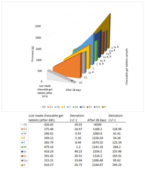 Firmness changes in chewable gel tablets after 28 days kept at room temperature in an open plastic bag. * Device did not measure value after 28 days, it was higher than 6500 g, a statistically significant change after 24 h vs. G1; b—statistically significant change after 28 days vs. G1, p < 0.05, n = 8.