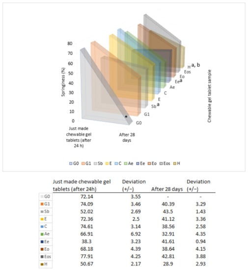 To determine the preservatives’ influence on the chewable gel tablets’ texture, a study was prepared where the firmness and springiness of the gel tablets were measured in OR storage conditions. Firmness is a parameter which shows chewable gel tablet’s strength and tightness. In this study it was measured how much strength is needed to compress 50% of gel tablet’s height. In Figure 7 the change of firmness is shown. Chewable gel tablets without glycerol (G0) had a higher firmness—from 426.45 ± 20.03 g to over 6500 g (the analyzer did not measure the correct value). After 24 hours, the firmness of the gel tablets with preservatives was measured and it was determined that aqueous extract of nutmeg (Ae), ethanolic extract of nutmeg (Ee), and nutmeg hydrolat statistically significantly increased the firmness by about 16.64 ± 7.76%, but sodium benzoate (Sb), citric acid (C), nutmeg essential oil (Eo), and essential oil solution (Eos) significantly decreased the firmness by about 24.86 ± 9.90% compared to the G1 sample. To compare the preservatives’ influence on firmness after 28 days, it was determined that the force needed to compress the gel tablets by 50% of H, C, and Ee samples was significantly higher than in the G1 sample (2164.87 ± 249.25 g, 1674.25 ± 125.34 g, and 1556.5 ± 155.46 g vs. 1188.2 ± 128.96 g). Other results did not show a statistically significant change after 28 days (Figure 7).