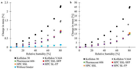 The blend of lactose and silicium dioxide barely changed in mass independently of the relative humidity (Figure 1a). Therefore, the binders were crucial for water sorption. The results of powder blends and pure binders exhibited the same trends regarding the order of applied binders (Figure 1a,b). The water uptake of pure binders equated to about twentyfold the water uptake of blends and thus corresponded to the amount of binder. Cellulose-based polymers led to lower changes in mass, which were comparable between the HPC types and HPMC. However, HPCs might absorb little more water than HPMC at high relative humidity, e.g., HPC SSL-SFP presented a change in mass of 15.5% at a relative humidity of 80.2%, where the weight of Pharmacoat 606 increased 14.5%. Even after a closer look, HPC SSL-SFP and HPC SSL did not present differences, but HPC SL-FP showed a slightly lower water uptake than HPCs of lower molecular weight (change in mass of 10.1%, 10.1%, and 9.8%, respectively, at 70.1% relative humidity). Nevertheless, mentioned differences between the cellulose-based polymers were only minor, and measurement was only performed once for pure binders and once for blends. The longer cellulose chains of HPC SL-FP might be less flexible and permit less water uptake than the shorter cellulose chains of HPC SSL. The lower hygroscopicity of HPMC might correlate with the methyl substituent. Kollidon 30 was most hygroscopic and presented a change in mass up to more than 45% (related to the mass of pure Kollidon 30) at about 80% relative humidity (Figure 1b). The second highest water uptake was observed for Kollidon VA64.