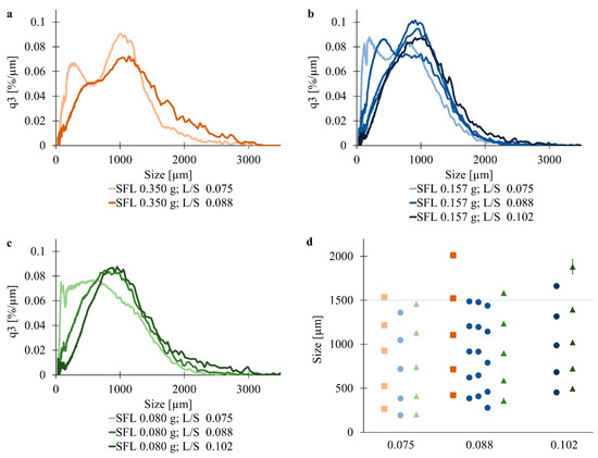Density distribution of (a) SFL 0.350 g, (b) SFL 0.157 g and (c) SFL 0.080 g at different L/S (n = 3; ) and (d) x values (x10%, x25%, x50%, x75%, x90%) of SFL 0.350 g (■, brown), SFL 0.157 g (●, blue) and SFL 0.080 g (▲, green) at different L/S (darker nuance with increasing L/S; n = 3; ± sd).