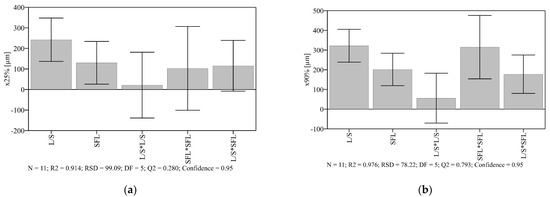 SFL, as well as L/S, presented an influence on the particle size distribution of granules. At SFL 0.350 g, L/S 0.075 led to a bimodal PSD, whereas L/S 0.088 led to a rather monomodal distribution (Figure 2a). Higher liquid contents reduced the fraction of particles smaller than 500 µm. Besides the reduction of fines and small particles, L/S 0.088 resulted in more particles larger than 1300 µm compared to L/S 0.075. However, obtained granules exceeded the x90% limit value, independently of the L/S, when granulation was performed at SFL 0.350 g (Figure 2d). The formation of partly high fractions of large agglomerates was also described in several studies, where granulation was performed with different powder blends, screw configurations, and barrel fill level [6,26,27,28,29,30]. At SFL 0.157 g and SFL 0.080 g, L/S 0.075 resulted in trimodal and bimodal PSD, respectively, whereas L/S 0.088 and L/S 0.102 resulted in a monomodal PSD (Figure 2b,c). Especially at SFL 0.080 g, L/S 0.102 presented a right-shifted curve compared to L/S 0.088. Contrary to SFL 0.350 g, x90% limit value was not exceeded at L/S 0.075 when granulation was performed at lower SFLs (Figure 2d). Repetition of center point settings led to divergent PSDs, although process data were comparable. Further increase of the liquid amount to L/S 0.102 led to x90% larger than 1600 µm (SFL 0.157 g) and 1800 µm (0.080), respectively. Observations were clarified by statistical analysis with Modde (Figure 3a,b). A higher L/S significantly increased all investigated x values. Caused by a higher amount of water, more powder particles could be wetted or solved, more liquid bridges were formed, and therefore agglomeration was enhanced. An increase of granule sizes at higher L/S was also observed in former studies of twin-screw granulation [9,11,29,31,32]. Moreover, bimodal PSDs were observed at lower L/S. Assumptions comprise unequal wetting or lower liquid availability on the particle surface, which led to less coalescence of larger particles [6,7,9].