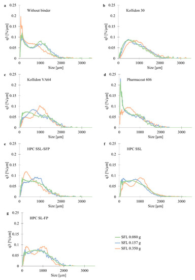 The influence of SFL depended on the binder (Figure 4a–g). For all granules, SFL 0.350 g differed from lower SFLs. Nevertheless, in the case of binderless granulation, SFL 0.350 g resulted in a higher fraction of fines. Granules without binder probably were less stable, and abrasion occurred at higher fills. This would also explain fewer large particles than at granulation with some binders, e.g., Kollidon 30. When granulation was performed with Kollidon 30, SFL had only a slight influence. An increase of SFL led to a right-shift of the PSD, but the shape was not influenced. Independently of the SFL, the PSD was monomodal. In contrast, SFL presented a more distinct impact in the case of Kollidon VA64. The global maximum of the PSD exhibited a right shift and an increase at higher SFL. So, the higher SFL might lead to an increase in particle interactions and increased formation of agglomerates. However, SFL barely impacted particles larger than 1300 µm. Granulating with Pharmacoat 606, the fraction of fines was distinctly influenced by the SFL. SFL 0.350 g reduced fines and increased particles at size range from 350 µm to 770 µm. Only the highest examined SFL seemed to be able to ensure enough interactions and, therefore, a reduction of fines. This observation differed from other binders, where lower SFL did not result in a comparable fraction of fines. HPC SSL-SFP as binder led to monomodal or nearly monomodal PSDs. Surprisingly, SFL 0.350 g resulted in most particles in the range of 200 µm to 600 µm. However, other powder compositions did not show this trend. The higher fill level might increase the abrasion of larger agglomerates resulting in smaller granules. SFL 0.080 g and SFL 0.157 g resulted in more particles between 600 µm and 1100 µm. The coarser powder quality of the chemical equivalent polymer, HPC SSL, presented bimodal (SFL 0.080 g and SFL 0.350 g) or trimodal (SFL 0.157 g) PSDs. Usage of a higher molecular weight (HPC SL-FP) led to bimodal PSDs. Bimodality was most distinct at SFL 0.350 g. The highest SFL presented more small particles than SFL 0.157 g and SFL 0.080 g, more particles at the size range of 1000 µm but fewer particles larger than 1500 µm. The reduction of fines at higher L/S, which was observed at different compositions, was also determined in the screening study (3.2) and might be a consequence of increased wetting of particles and development of liquid bridges, and in consequence, formation of agglomerates.