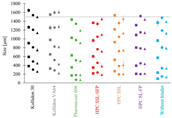 Comparing granules with and without binder, a reduction of fines was observed when a binder was added (Figure 4a–g). However, Pharmacoat 606 could almost not decrease the fraction of fines in relation to binderless granules. x50%, x75%, and x90% of binderless granules were comparable to some binder containing granules, for example, HPC SSL-SFP (Figure 5). Granulation without a binder did not lead to a distinct reduction of large particles. This would be a consequence of less binding capacity in the absence of a binder. The size of large particles was small enough to meet the requirements at two of three SFLs, but the usage of some binders also resulted in acceptable x90%.