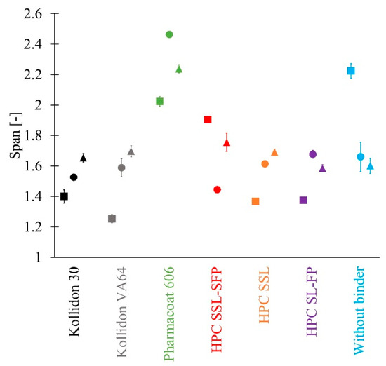 Span was sparsely influenced by the choice of binder (Figure 6). The addition of most binders resulted in a reduction of the span except Pharmacoat 606, which stood out in particular by a higher span of at least 2. At SFL 0.157 g and SFL 0.080 g, it was even higher than the span of granules without a binder. However, except SFL 0.350 g, the span of binderless granules was at a comparable range as the most binder containing granules. The SFL might also impact span. Kollidon 30, Kollidon VA64, and HPC SSL presented an increase of span at lower SFL. It is possible that the influence is inverted when no binder is used.