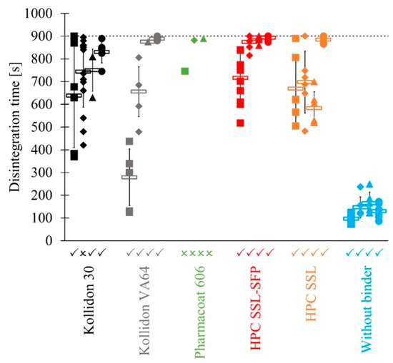 Most of the examined tablets presented erosion rather than disintegration. This might be caused by the formation of a gel layer by the binder at the tablet surface. Therefore, penetration of water into the tablet was inhibited. Erosion resulted from the removal of the gel layer. Some tablets passed the disintegration test independently of applied pressure (Figure 7). Tablets manufactured with Kollidon VA64, HPC SSL-SFP, and HPC SSL as well as tablets without binder disintegrated within 15 min. Kollidon 30 led to tablets that passed the disintegration except the lot manufactured at 100 MPa. However, although disintegration tests were passed, disintegration needed nearly 900 s when compression was performed at 300 MPa, and a binder was used. By contrast, tablets without binder always disintegrated within 300 s at the maximum. The disintegration of tablets containing Pharmacoat 606 or HPC SL-FP mostly required more than 900 s and therefore failed. One tablet of each Pharmacoat 606 lot passed. In the case of HPC SL-FP, no tablet passed, which is why HPC SL-FP is not presented in Figure 7. The viscosity of generated gel layer might have been too high to enable the penetration of water into the tablet. HPC SL-FP possesses a higher molecular weight than HPC SSL. The lower molecular weight of HPC SSL resulted in a lower viscosity of the gel layer and, thus to faster disintegrating tablets. Examinations of water sorption (3.1) presented faster and more pronounced water sorption of Kollidon 30 and Kollidon VA64 than of HPCs and Pharmacoat 606. Moreover, HPC and HPMC stay at the gel state for a longer time than PVP before they changed into a solution [25]. Both observations could explain the slower disintegration of tablets containing Pharmacoat 606 and HPC SL-FP compared to Kollidon 30 and Kollidon VA64. However, the disintegration of tablets containing HPC SSL-SFP and HPC SSL was not always slower than that of tablets containing Kollidon 30 and Kollidon VA64, which could be assumed based on the results of water sorption.