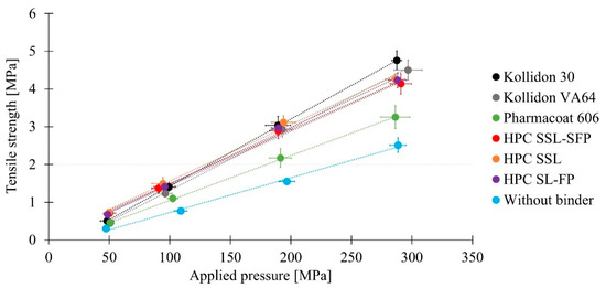 Using a higher applied pressure, stronger tablets were received caused by greater densification (Figure 8). The absence of a binder led to the lowest tensile strength independent of applied pressure. Pharmacoat 606 also resulted in tablets with lower tensile strength than other binders. Kollidon 30, Kollidon VA64, HPC SSL-SFP, HPC SSL, and HPC SL-FP presented comparable tensile strengths. Concerning only mean tensile strength, Kollidon 30 led to the highest tensile strength at highest applied pressure and showed as well as Kollidon VA64 a great increase of tensile strength with rising applied pressure. It has been described in the literature that tablets containing different HPC types presented comparable tensile strengths when applied pressures were below 113 MPa [37]. At higher pressures, HPCs with lower molecular weight led to more resistant tablets. Authors supposed the correlation of strength and molecular weight to higher deformability of shorter HPC SSL polymer [37]. Applying dry granulation, higher tablet tensile strengths at decreasing molecular weight of HPCs were also described in a comparison of HPC SSL-SFP, HPC SSL, and HPC L-FP (molecular weights of 40,000, 40,000, and 140,000, respectively). The differences in tablet tensile strengths increased at rising compaction pressures [20]. However, Mangal et al. [20] used roll compaction for granulation, and therefore compressed granules differed from the present study. Divergence in granulation technique would also explain the different results to another dry granulation study, where HPC SSL-SFP revealed the highest tensile strength followed by Kollidon VA64 and HPC SL-FP, which had overlapping standard deviations and lowest tensile strength was observed for Kollidon 30 [19]. The low tensile strength of HPMC (Methocel E5 Premium LV) tablets was also described in comparison with Kollidon 30; however, the variation was not significant [41].