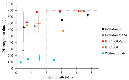 Implying both examined quality criteria, where differences were determined, revealed that some binders, but also an absence of binder, could lead to acceptable tablets (Figure 9). Working without a binder required higher applied pressure to achieve sufficient tensile strengths but had the advantage to disintegrate fast without any problems, even without disintegrant. By contrast, tablets that contained binder and exhibited sufficient tensile strengths often did not disintegrate within 900 s or were close to the limit. A disintegrant might solve this problem. In this study, best results were achieved without binder and compression at 300 MPa, with Kollidon 30 at 200 MPa and 300 MPa, as well as with HPC SSL at 300 MPa.