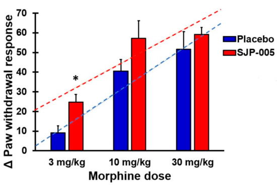 | 4 | Morphine 3 mg/kg bw + SJP-005 | 22.1 (3.4) | 46.8 (3.9) | 0.000 * | - |