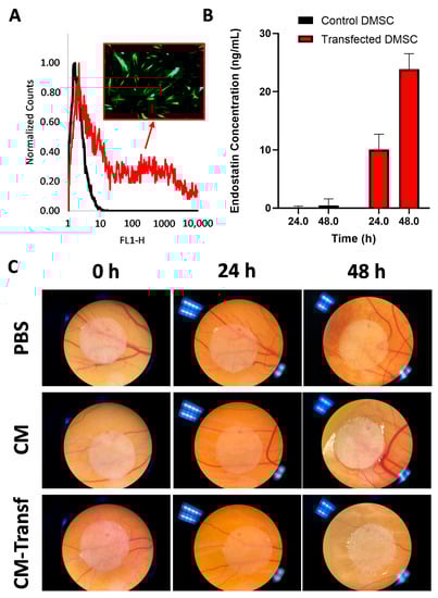 Flow cytometry histograms of DMSC without (black) and with (red) transfection with a green fluorescent protein (GFP) plasmid through electroporation and insert with a fluorescence microscopy image of GFP-transfected DMSC (A); ELISA measurement of endostatin in the culture medium of DMSC and transfected DMSC with the endostatin plasmid (B); and the effect on chick chorioallantoic membrane (CAM) vasculature of PBS and conditioned media of DMSC (CM) and transfected DMSC (CM-Transf) with the endostatin plasmid (C). Data are means ± SD; n = 3.