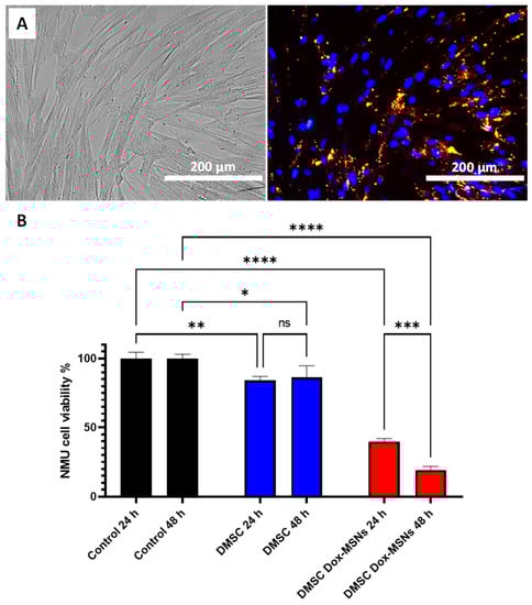 Microscopy of DMSC cultured with red-fluorescent (R)-MSNs showing bright field (left) and fluorescence images (right). Nuclei are stained in blue and R-MSNs are fluorescent in the red channel (A); NMU cell viability in coculture with DMSC without and with DOX@MSNs (B). Data are means ± SD, n = 3; ns p > 0.05; * p ≤ 0.05; ** p ≤ 0.01; *** p ≤ 0.001; **** p ≤ 0.0001.