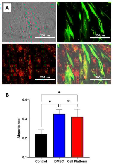 Bright field and fluorescence microscopy of GFP-transfected DMSC also cultured with R-MSNs. Green fluorescence due to GFP expression and R-MSNs fluorescence in the red channel (A); DMSC in vitro migration assay towards NMU culture without (DMSC) and with transfection plus DOX@MSNs (cell platform) (B). Data are means ± SD, n = 3; ns p > 0.05; * p ≤ 0.05.