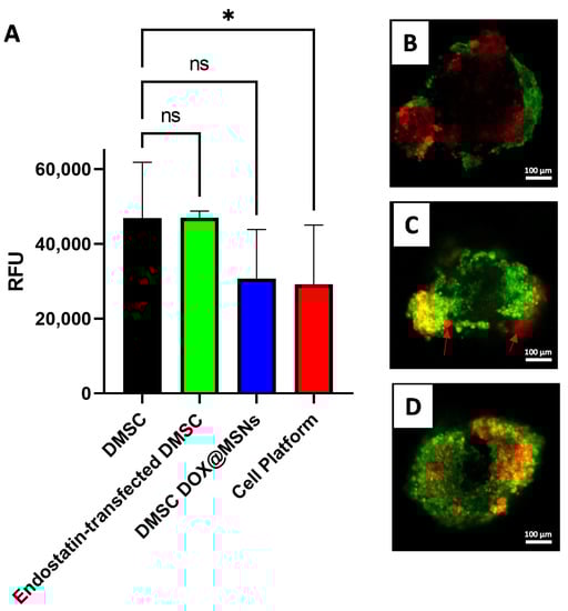 These results show the great potential of the designed cell platform for combined therapy in cancer. The concurrent use of two therapeutical approaches, the cytotoxic effect of doxorubicin and the antiangiogenic effect of endostatin, may offer several advantages in the treatment of solid tumors. Due to their vascular abnormality, tumors are known to have impaired blood perfusion and offer resistance to chemotherapy []. Endostatin has been used to normalize the aberrant vasculature in tumors [] and this effect has even been explored in clinical settings []. In combination with doxorubicin, endostatin has been shown significant tumor and metastasis inhibition in mice 4T1 breast cancer []. Nevertheless, systemic administration of these drugs implies toxic effects. The use of DMSC as a cellular vehicle for anti-tumor drugs could reduce their unwanted side effects and could also increase therapeutic doses at the local tumor site [,,]. In the future, validation of our cell platform strategy in different in vivo models will be necessary. In addition, incorporation of stimuli-responsive nanoparticles for a controlled drug release could further improve this antitumor strategy.