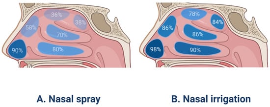 Nasal irrigation (Figure 1B), also termed nasal wash, rinse, douche, or lavage, can reduce the severity of infections of the nasal cavity and sinuses. Furthermore, it is typically recommended for patients after sinus surgery [82]. Syringes, pots, and various types of squeeze bottles can be employed for nasal irrigation and can improve mucociliary clearance, as well as symptoms of nasal stuffiness and obstruction [83]. A previous study has evaluated nasal irrigation systems in terms of their physical rinsing parameters [84], for the whole nasal cavity and paranasal sinuses flushing, it is recommended that the compressible flushing system has a better minimum output pressure of 120 mbar, a good connection between the outlet and the nostril (possibly inserted into the nasal vestibule), and an upward flushing flow (45°). However, low-volume drug delivery is not as effective as high-volume drug delivery in penetrating paranasal sinuses [85]. In the international consensus statement of allergy and rhinology: rhinosinusitis in 2016, it is strongly recommended that large volume (>200 mL) nasal saline irrigation be used as an auxiliary means for other drug treatment of CRS [86]. A recent study involving 418 patients with rhinosinusitis showed that large-volume nasal irrigators were more effective than other types of irrigators in removing nasal secretions and reducing postnasal drip [87]. Kanjanawasee et al. [88] compared the effects of nasal irrigation using hypertonic saline (HS) and isotonic saline (IS) in treating sinonasal diseases. The results showed that HS improved symptoms over IS in treating sinonasal diseases; however, HS presented an increased number of minor side effects than IS. However, it remains controversial which saline demonstrates greater clinical effects in patients with CRS. A study has compared the effect of Dead Sea Salt (DSS) irrigation and DSS nasal spray with saline irrigation and local nasal steroid spray. The results showed that both groups showed significant improvement in mean Sino-Nasal Outcome Test 20 (SNOT-20) scores following treatment, but the degree of improvement did not significantly differ between the two groups [89]. Kent et al. compare the distribution of nasal irrigation to nasal spray by scoring the cadaveric specimen surface area stained by methylene blue [90], and no significant difference was observed in the nasal vestibule, inferior turbinate, and middle turbinate between nasal irrigation and nasal spray; however, nasal irrigation was distributed more widely than nasal spray in the sphenoethmoidal recess, superior turbinate and ostiomeatal complex (Figure 2). Harvey et al. [23] gave 2 mg mometasone to 44 patients with CRS by nasal spray or nasal irrigation in the treatment of CRS after sinus surgery and showed that a one-year posttreatment blockage, drainage, fever, and total visual analog scores were all lower in the corticosteroid irrigation group than nasal spray group.