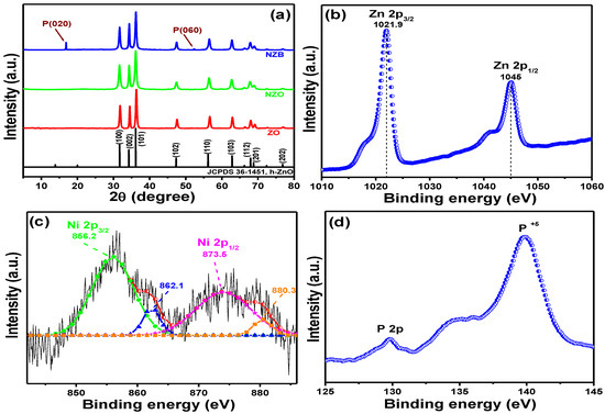 (a) XRD patterns of ZO, NZO (nickel (Ni) doped zinc oxide), and NZB (NZO combined with a black phosphorus nanocomposite)-samples. XPS spectral analysis of the NZB nanocomposite: (b) Zn 2p peaks. (c) Gaussian-fitted curves of the Ni 2p peaks. (d) P 2p core peaks.