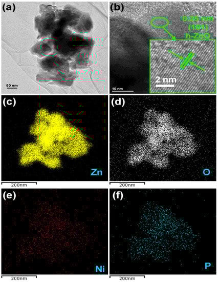 (a) TEM image and (b) HRTEM image of the NZB sample. Elemental mapping images for (c) zinc, (d) oxygen, (e) Ni, and (f) P elements of the NZB sample.