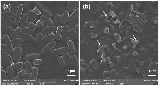 Morphology change of NCCP16283. SEM images (40.0 kx magnification) of NCCP16283 after (a) non-treatment and treatment of (b) PolB (0.2 μg·mL−1) with NZB (62.5 μg·mL−1). Images are one of the representatives from n = 8. White arrows indicate the disruption of bacterial cells.