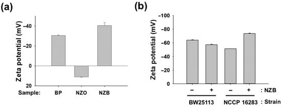 where η is the medium viscosity and ε the medium dielectric constant [27], of BP, NZO, and NZB or E. coli cell suspensions in DW were measured with a Nanopartica SZ-100 (Horiba Scientific) according to the manufacturer’s instructions. E. coli cells of BW25113 and NCCP16283 were cultured overnight with and without treatment of sub-minimum inhibitory concentration (MIC) concentration of NZB (125 μg·mL−1), were diluted to OD600 = 0.5. Thereafter, cell pellets were obtained by centrifugation at 12,000 rpm for 2 min, washed three times with phosphate-buffered saline (PBS), and resuspended in 1 mL of DW to measure the zeta potential. Zeta potential values shown for individual samples are the means of at least five measurements ± standard deviation (p < 0.05).