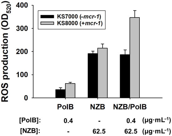 While SEM images have shown bacterial damage by NZB/PolB combination (Figure 3), it is not clear what particular mechanism is involved in the bacterial cell death by NZB. The production of reactive oxygen species (ROS) is considered to be one of the well-established and efficient antibacterial mechanisms [17]. As an initial mechanistic study of synergistic action of NZB with PolB, ROS production of KS7000 (−mcr-1) and KS8000 (+mcr-1) cells upon treatment of PolB (0.4 μg·mL−1), NZB (62.5 μg·mL−1), or NZB (62.5 μg·mL−1)/PolB (0.4 μg·mL−1), respectively, was evaluated. As shown in Figure 5, both cells produced 1.5 times more ROS upon NZB treatment than that of PolB without preference. However, the combined use of NZB and PolB showed that KS8000 selectively produced 1.5 times more ROS, while KS7000 did not produce more ROS. Therefore, the synergistic antibacterial activity of NZB/PolB combination for Mcr-1 modified E. coli cells can be attributed to higher ROS production.