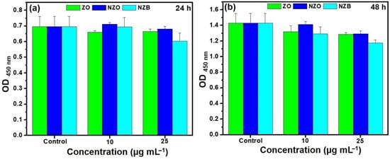 Cell viability (WST assay) of ZO, NZO, and NZB exposure observed in HEK293 (human embryonic kidney) cells with various concentrations for (a) 24 h and (b) 48 h. Error bars represent the standard deviation (SD). p < 0.05 indicates significant differences.
