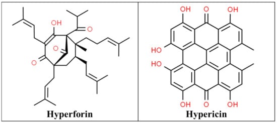 St John’s Wort (SJW) is extracted from the flowers and leaves of the plant Hypericum perforatum native to Asia and Europe, which was later introduced to North America by the Europeans. It includes at least 10 active constituents but the two principal pharmacological components are hyperforin and hypericin (Figure 1), which are responsible for their beneficial effects [9,10]. Hypericin can inhibit serotonin, norepinephrine, and dopamine reuptake, weakly inhibits monoamine oxidases (MAOIs) A and B and the crude extracts have a high affinity for gamma-aminobutyric acid (GABA) receptors. This has led to its role as an anxiolytic, sedative, antidepressant, and analgesic [11].