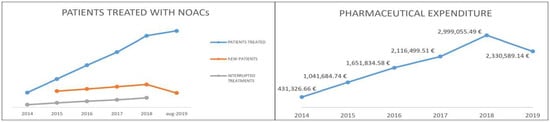 Table 3 shows the data, compiled through the Regional Health Information System–Edotto, relating to LHA BT in the period January 2014–August 2019. In particular, the number of new patients treated annually and the number of patients who discontinued treatment are shown [44]. The number of interrupted treatments is high due to patients who started NOACs treatment for the prevention of venous thromboembolic events (after elective hip or knee replacement surgery) and patients taking NOACs for a short-term treatment (at least three months) based on transient risk factors of DVT and PE, under the available guidelines. Figure 1 shows the trend of pharmaceutical spending supported by LHA for the purchase of NOAC (dispensed through the “distribuzione per conto”—DPC channel) in the period January 2014–August 2019 [45].