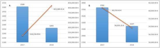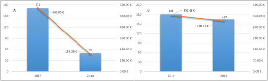 In 2018, 3197 (85%) patients continued therapy. Pharmaceutical expenditure was 58,935.25 euros, with an average cost for the treated patients of 18.43 euros (Figure 2B).
