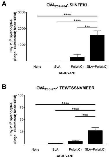 To confirm whether the levels of killing observed were linked to the number of Ag-specific T cells, we also analyzed the splenocytes of these mice using an IFN-γ ELISpot as outlined above. As expected, immunization with OVA SLP + SLA + Poly(I:C) resulted in significantly higher levels of SIINFEKL-reactive CD8+ and TEWTSSNVMEER-reactive CD4+ IFN-γ+ T cells than vaccination with any of the other tested vaccine formulations (Figure 2B,C, p < 0.001). Interestingly, the levels of IFN-γ+ SFCs when stimulated with SIINFEKL obtained in mice which had received CFSE-labeled cells were lower than those obtained in mice which had not received CFSE-labeled cells (Figure 1). While the dosing schedule was different, this may be partly due to trafficking of SIINFEKL-specific T cells from the spleen to the periphery following intravenous delivery of the target cells for the in vivo CTL assay.