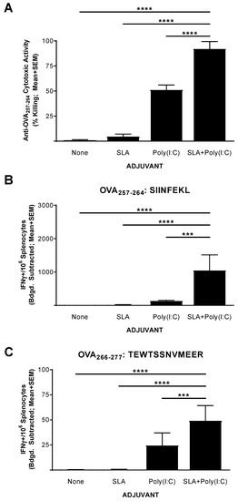 The functionality of the CD8+ T cell response generated by the above vaccine formulations was confirmed in an in vivo CTL assay. Mice (n = 5 per group) were immunized on days 0, 7, and 14 with OVA SLP alone or in combination with SLA, Poly(I:C), or SLA + Poly (I:C). Splenocytes were collected on day 20 (6 days following the third vaccination) and analyzed for in vivo cytolytic activity and by IFN-γ ELISpot. Supporting the results obtained with the IFN-γ ELISpot assay above, the percentage killing of SIINFEKL-pulsed cells in mice administered the unadjuvanted or SLA-adjuvanted vaccine formulations was quite low (i.e., means ± SEMs of 1 ± 0.6 and 4.5 ± 2.6, respectively; Figure 2A). The inclusion of Poly(I:C) in the vaccine formulation resulted in a moderately high level of killing with a mean ± SEM of 51% ± 5, which was significantly higher than seen in mice administered with the unadjuvanted or the SLA-adjuvanted OVA SLP vaccine formulations (p < 0.0001). A significantly higher level of SIINFEKL-specific cytolytic activity was seen in the mice immunized with OVA SLP + SLA + Poly (I:C) vs. OVA SLP + Poly (I:C), with a mean ± SEM of 92% ± 3.3 (p < 0.0001). The level of killing seen here with the OVA SLP + SLA + Poly(I:C) formulation compares favorably to previous results obtained in mice immunized with OVA whole protein admixed with SLA, where ~75% cytolytic activity was measured using a similar assay [13].