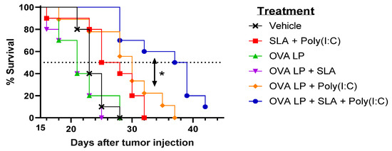 Efficacy of OVA SLP vaccine formulations in a B16-OVA tumor model. C57BL/6 mice (n = 10/group) were injected s.c. with 5 × 105 B16-OVA cells on day 0. Following tumor implantation, animals were immunized i.m. with OVA SLP (30 µg) with or without adjuvant on days 3, 10, and 17. Animal survival, clinical signs, and tumor growth were monitored 2–3 times per week. Mice were euthanized once they reached a humane endpoint. Statistical significance of difference for OVA SLP + SLA + Poly(I:C) vs. OVA SLP + Poly(I:C) is shown: * p < 0.05 by Mantel–Cox test.