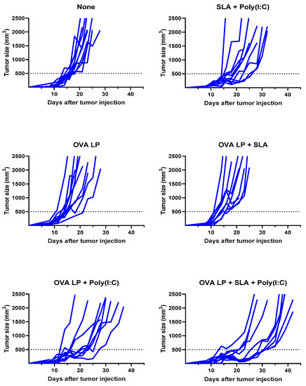 Kinetics of B16-OVA tumor growth in individual mice. C57BL/6 mice (n = 10/group) were injected s.c. with 5 × 105 B16-OVA cells on day 0. Following tumor implantation, animals were immunized i.m. with OVA SLP (30 µg) with or without adjuvant on days 3, 10, and 17. Tumor sizes were monitored 2–3 times per week and tumor volumes calculated (length × width × width/2).