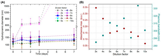 (A) Hydrodynamic diameter vs. time elapsed from the synthesis of AuNSs at various dilution factors from 1× to 10×; (B) absorbance maxima (left) and plasmon bandwidths (right) of AuNSs in colloidal solution at various dilution factors.