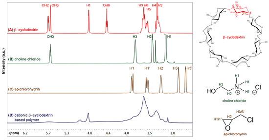 1H-NMR spectra of (A) β-cyclodextrin, (B) choline chloride, (C) epichlorohydrin, and (D) cationic β-cyclodextrin-based polymer and their molecular structures and proton assignments (left).