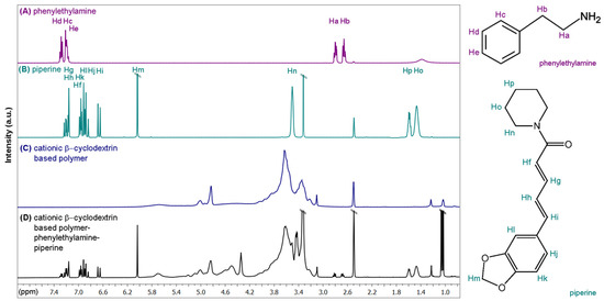 1H-NMR spectra of (A) phenylethylamine, (B) piperine, (C) cationic β-cyclodextrin-based polymer, and (D) cationic β-cyclodextrin-based polymer loaded with phenylethylamine and piperine; the molecular structures and proton assignments of the drug molecules are shown on the left.